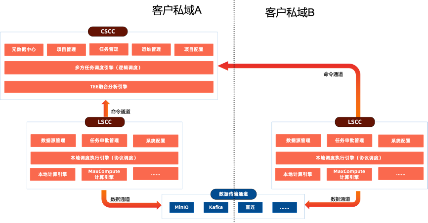 - 云上部署架构:云上部署CSCC,客户在云上VPC或自有IDC机房等私域环境下部署LSCC。优点是各参与方无需部署和运维CSCC,由云平台作为第三方承担协调方的职责,各参与方仅需部署轻量化的LSCC即可完成本地安全计算。