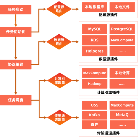 遵循插件化的设计思路,随着支持业务落地过程中,目前已经支持了多种常见的配置源、数据源、计算引擎、传输通道等核心组件插件,而且能够快速扩展新的插件实现。