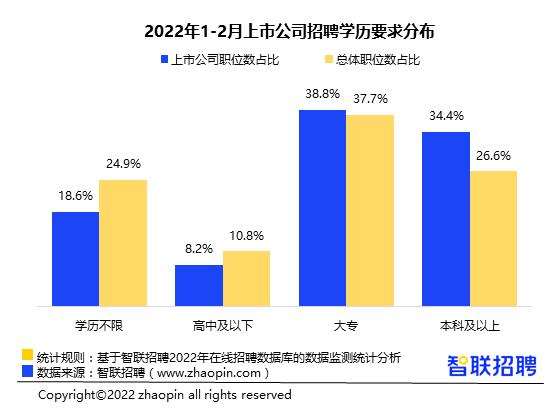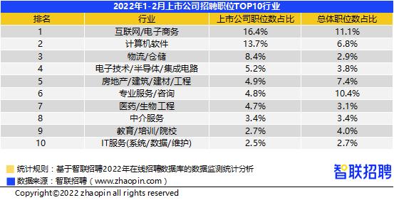 行业方面,智联平台数据显示,上市公司招聘需求前三行业为互联网 / 电子商务、计算机软件、物流 / 仓储,2022 年 1-2 月招聘职位数在所有上市公司的占比分别是 16.4%、13.7%、8.4%,比例明显高于全平台总体职位在这些行业的占比,分别高出 5.3 个百分点、6.9 个百分点、5.5 个百分点。排在第四的是集成电路行业,占比 5.2%,也高出总体职位占比 1.4 个百分点。综合来看,上市公司招聘更集中在互联网相关和高精尖行业。这些技术壁垒高的行业更容易在市场优胜劣汰下形成大型上市公司,或本身需要强大的资本和技术投入,因此天然产生巨头企业。