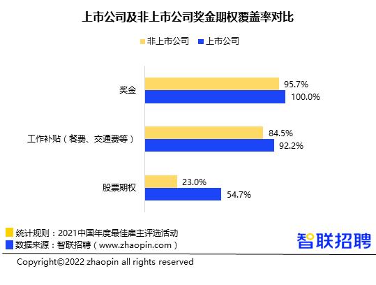 奖金期权福利可谓是既有工资基础上,提升员工工作动力的制胜绝招。数据显示,上市公司奖金覆盖率 100%,高出非上市公司 4.3 个百分点。92.2% 上市公司提供餐费、交通费等工作补贴,高出非上市公司 7.7 个百分点。尤其在股票期权方面,鉴于上市公司股票流动性带来的额外价值,上市公司相比非上市公司更乐意使用股权激励员工。54.7% 上市公司为员工提供股票期权,非上市公司覆盖率仅为 23%。