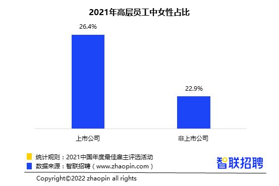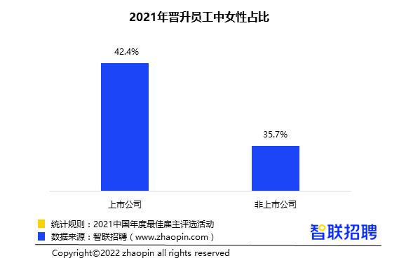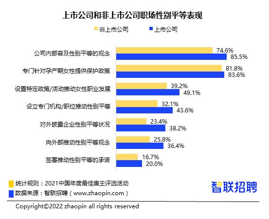 企业的职场性别平等主要表现在两个方面:女性在各个岗位的分布,以及公司在推动性别平等上的举措。数据显示,上市公司的女员工比例(45.2%)高于非上市公司(41.1%),高层的女性占比(26.4%)也高于非上市公司(22.9%)。2021 年上市公司晋升员工中,女性占 42.4%,比非上市公司高 7 个百分点。可见上市公司女性的晋升通道更顺利。