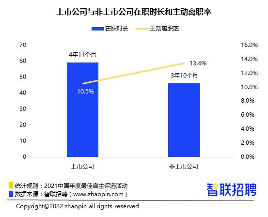 上市公司良好的发展前景、极具优势的薪资和福利待遇,均是其人才粘性的保障。数据显示,上市公司的员工平均在职时长为 4 年 11 个月,比于非上市公司长 13 个月。而主动离职率,上市公司低于非上市公司 2.9 个百分点。可见上市公司的员工稳定性较高,员工对企业的满意度高于非上市公司,良性循环将吸引更多人才加入。