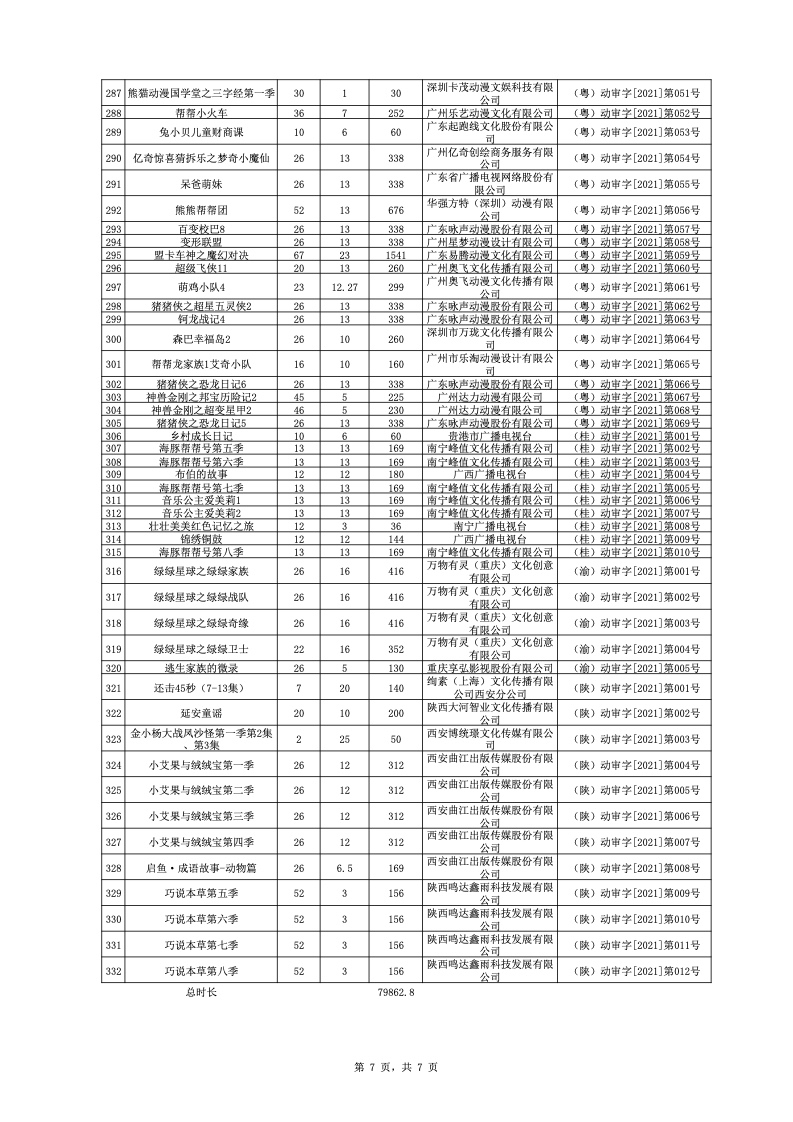 《通告》显示,2021年度全国国产电视动画片共发行332部,总时长达79862.8分钟。