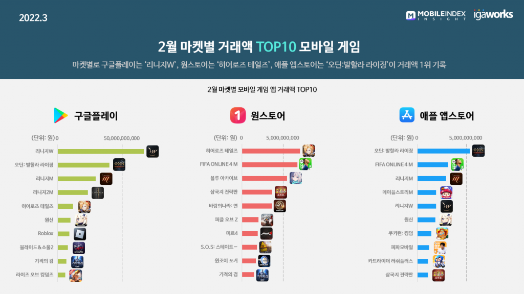 据Mobile Index 3月10日发布的数据显示,2月份韩国手游市场规模达5720亿韩元(约合30亿人民币)。其中,Google play以73.8%的绝对优势占据头名,ONE Store则以14.4%的占比,超越苹果11.8%的份额位列第二。