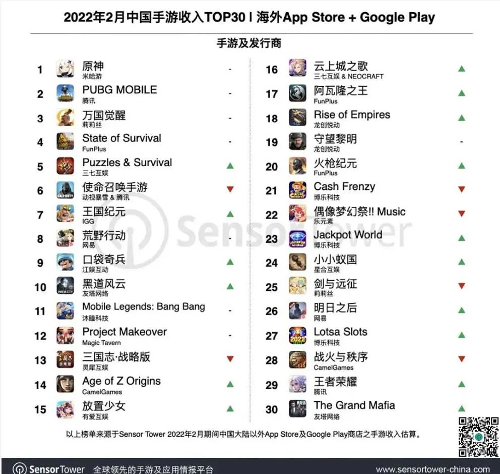 在各商店的收入榜单中,中国公司产品的身影可谓随处可见,三七互娱《云上城之歌(hero tales)》、米哈游《原神》、莉莉丝《万国觉醒》就分别占据了Google play 2月收入榜单的TOP 5、TOP 6、TOP 10。
