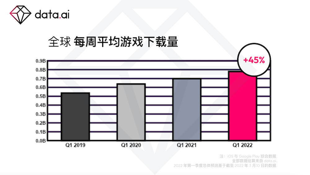 在下载量方面,Google Play 同比增长 15%,总下载量达到 140 亿次。游戏占 Google Play 总下载量的 44%,占 iOS 总下载量的 28%。值得注意的是,自新冠疫情蔓延以来,从 2019 年第一季度到 2022 年第一季度,游戏的平均周下载量增长了 45%。