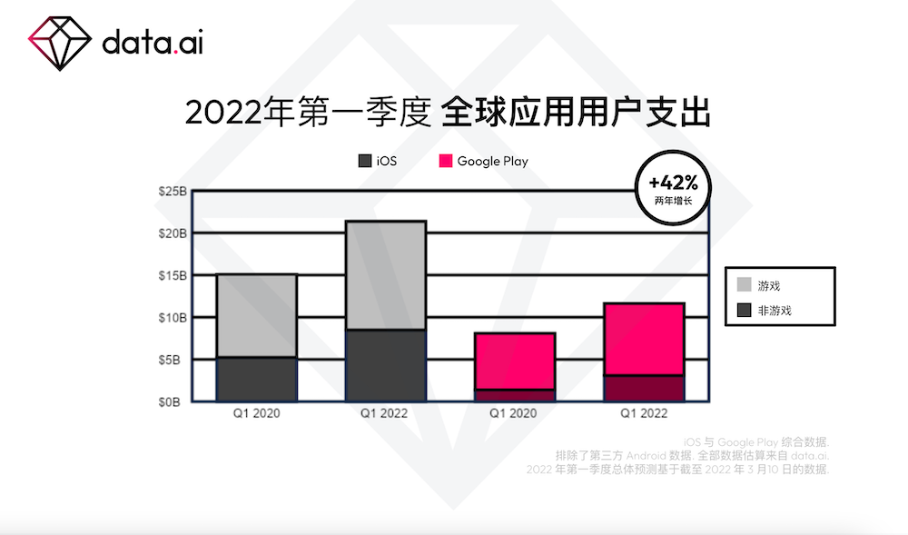 在繁荣的应用经济中,游戏一直是规模最大的单一类别。data.ai 最新的季度全球市场趋势显示,2022 年第一季度,游戏在用户支出方面占 Google Play 的 73%,占 iOS 的 60%。