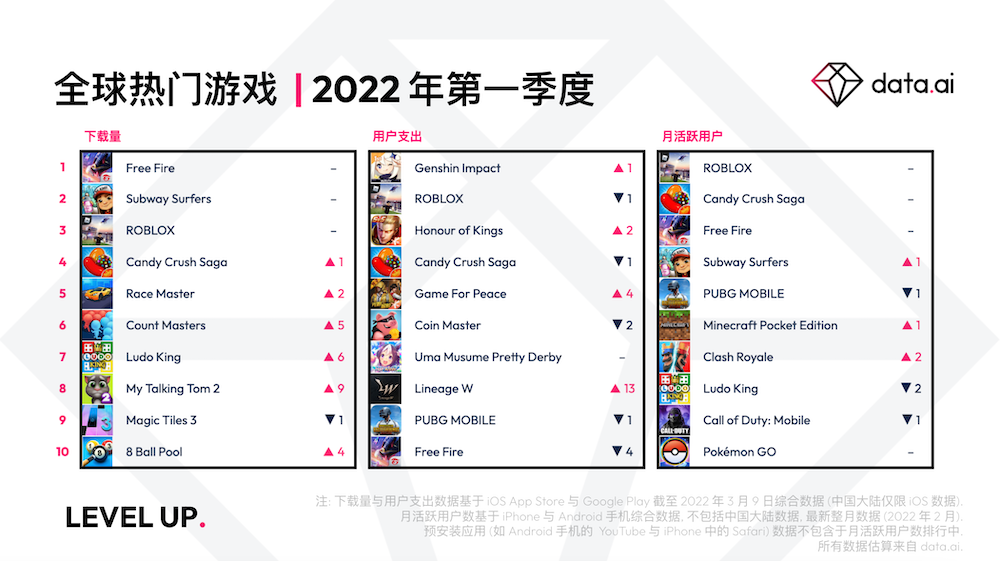 本季度下载量最高的游戏是由新加坡 Garena Online 发行的《Free Fire》。同时这款游戏也是 2021 年全年下载量最高的游戏。通过分析 data.ai Game IQ 游戏功能标签时,可以发现《Free Fire》采用了多种游戏功能,例如交替战斗模式以及卡片收集。该游戏成功地让用户参与到应用和现实生活中。根据 Game IQ 功能标签,《Free Fire》采用了 ‘活动日历’,事实上《Free Fire》World Series 2022 定于 5 月在新加坡举行。去年,World Series 活动的奖池达到了 200 万美元。而移动平台又是最受欢迎的游戏平台,我们一起期待今年会有怎样的惊喜等着我们。