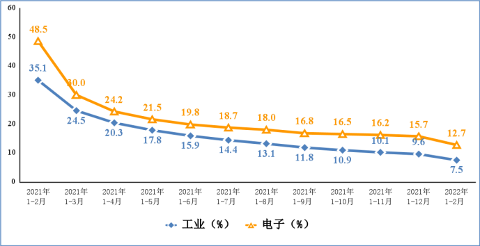 2022年1-2月份以来电子信息制造业和工业增加值累计增速。图片来源:工业和信息化部运行监测协调局