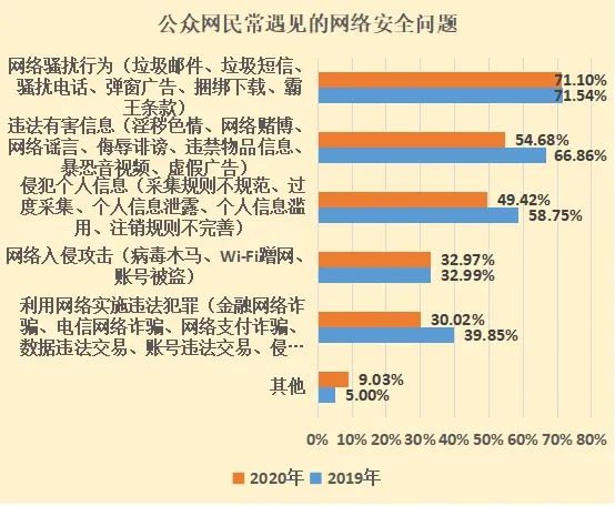 和 2019 年公众网民对网络安全感的评价数据相比,2020 年公众网民的网络安全感基本一致,中间增多,两头略有下降。2020 年认为网络非常安全和安全的公众网民达 50.04% 比 2019 年的 51.25% 要低 1.21 个百分点,认为网络安全一般的公众网民 2020 年比 2019 年高了 2.85 个百分点。认为不安全和非常不安全的比例有所下降。和 2018 年相比,负面评价呈持续减少趋势。