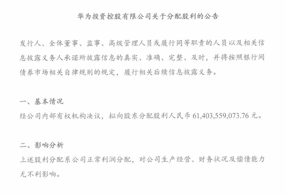 近日,华为投资控股有限公司提交给上海清算所的公告显示:经公司内部有权机构决议,拟向股东分配股利人民币61403559073.76元。华为是一家100%由员工持有的民营企业。股东为华为投资控股有限公司工会委员会和公司创始人任正非。截至 2021 年 12 月 31 日,任正非的总出资相当于公司总股本的比例约 0.84%。