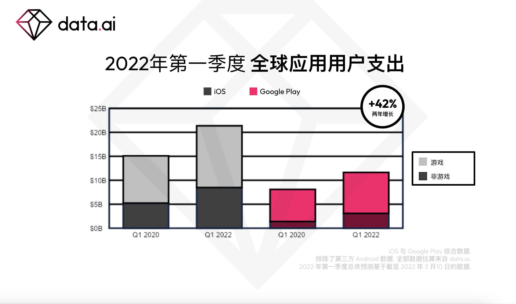 总体上看,我们预测应用的用户支出将在两年内增长超过 40%,其中 iOS 的总支出比 2020 年第一季度增长近 42%,而 Google Play 增长 44%。