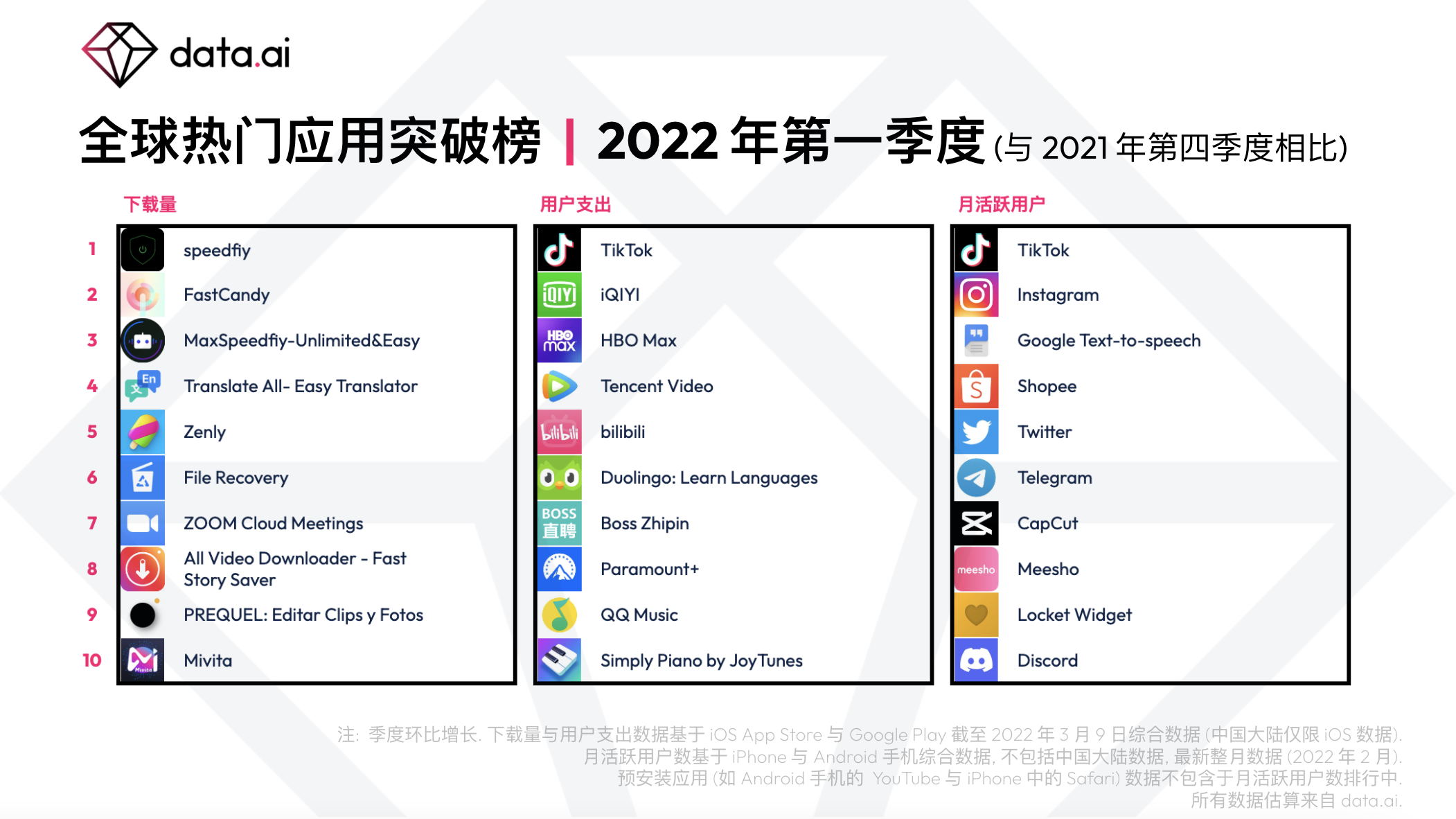 按下载量、支出以及月活跃用户(MAU)排名的全球热门应用往往每个季度都变化不大。占据主导地位的主要应用有:TikTok、Instagram、Facebook以及 YouTube。