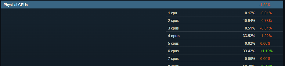 在CPU方面,四核CPU依然是最常见的,不过六核CPU的使用率正迎头赶上,在一两个月内有可能实现反超。此外,八核CPU的使用者也不在少数,而用双核处理器打游戏的老哥真的是越来越少了。