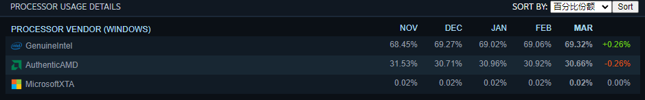 Windows系统下,Intel的使用量为69.32%,增长0.26%,AMD的使用量为30.66%,减少0.26%。