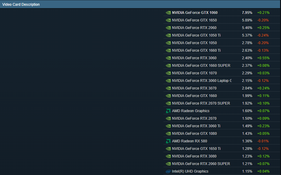 日前,V社公布了Steam 2022年3月的硬件和软件调查结果,本次就玩家的PC硬件、系统等内容进行了调查,此数据仅以接受Steam调查的用户为准。首先来看受关注的显卡部分,数据显示,3月最常用的显卡依旧是GTX 1060,坐稳“最牛钉子户”席位,同时其占有量还提升了0.21%,而RTX 2060凭借5.46%占有量、0.25%增长,超过GTX 1050 Ti,成为仅次于GTX 1060和GTX 1650的第三大显卡。