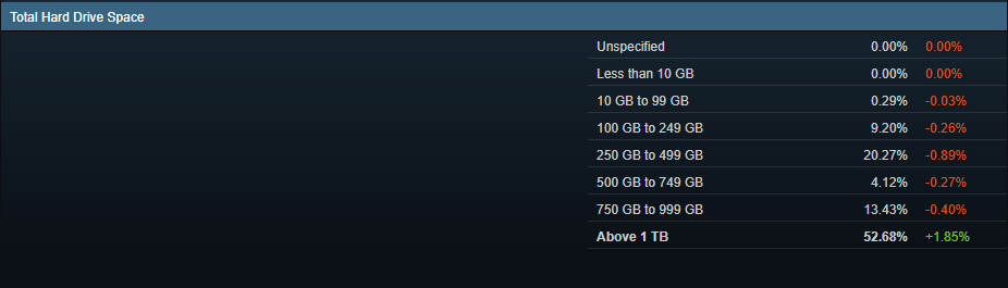 有意思的是,3月似乎有不少用户买了新的大容量硬盘,数据显示,硬盘总容量超过1TB的用户增长了1.85%。