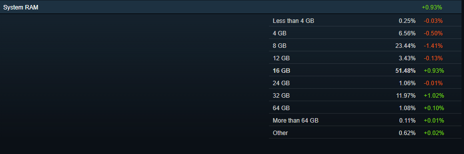 另外,16GB内存电脑的使用比例在持续增长中,达到51.48%,8GB内存用户占比降至23.44%。