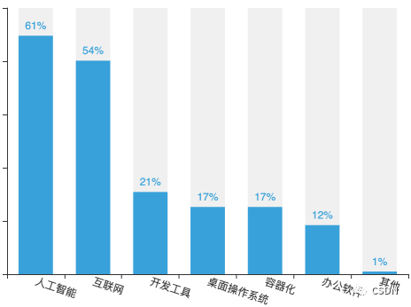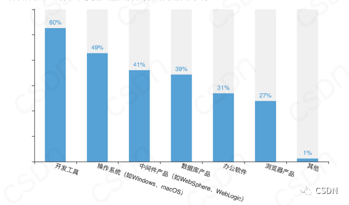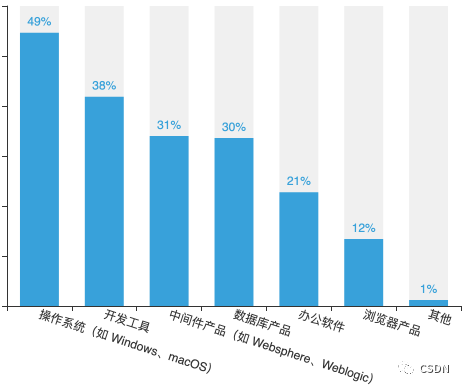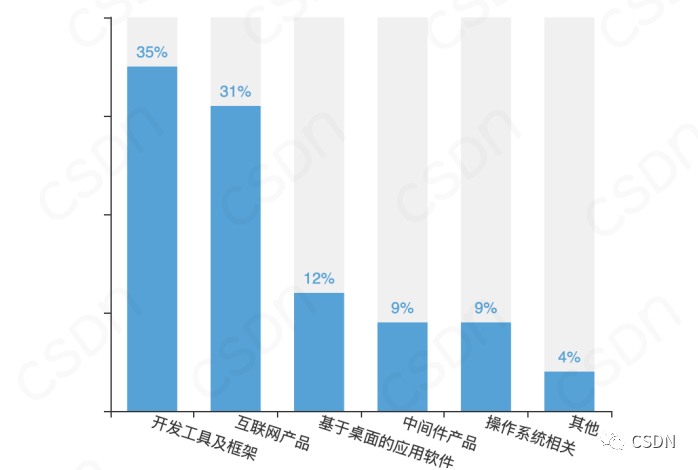 开发工具与框架、互联网产品是开发者首次接触开源项目的类别,占比 54%,该比例相较上一年有所下降,更多开发者开始从操作系统、应用软件、中间件产品等部分接触开源。