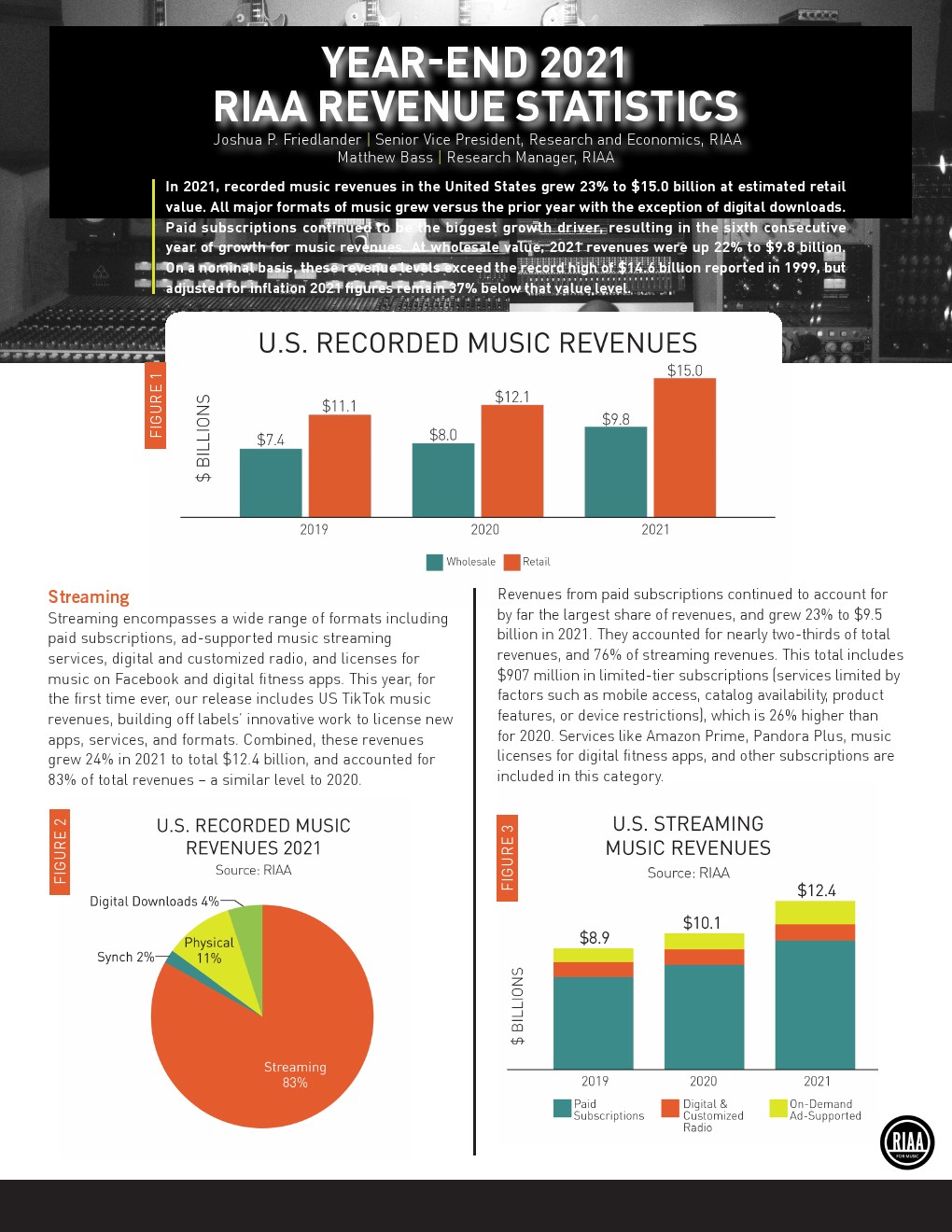 去年,流媒体占美国所有录制音乐收入的83%,与2020年的总收入份额大致相当。实体(11%)、数字下载(4%)和同步版税(2%)合起来是录制音乐收入的剩余份额。