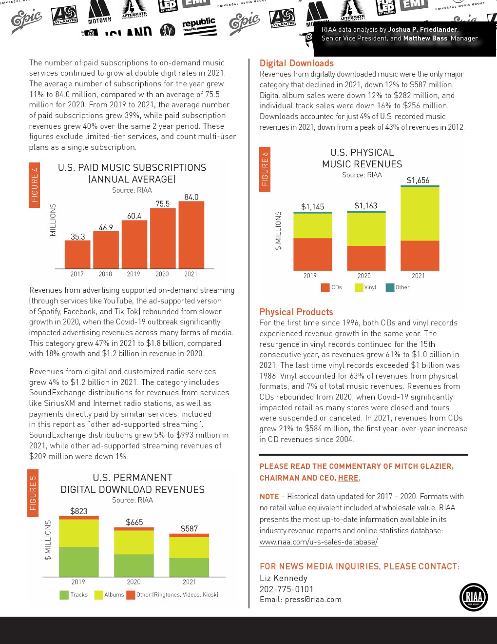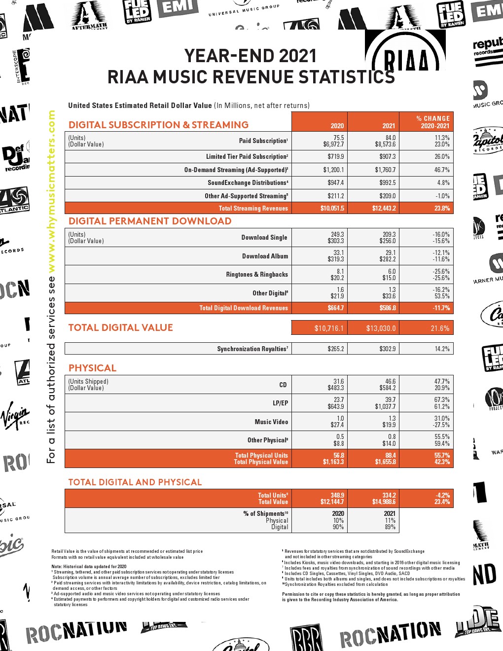 2021年是CD和黑胶唱片收入25年来首次出现增长。黑胶唱片收入增长了61%,达到10亿美元,这是35年来首次达到这一目标。
