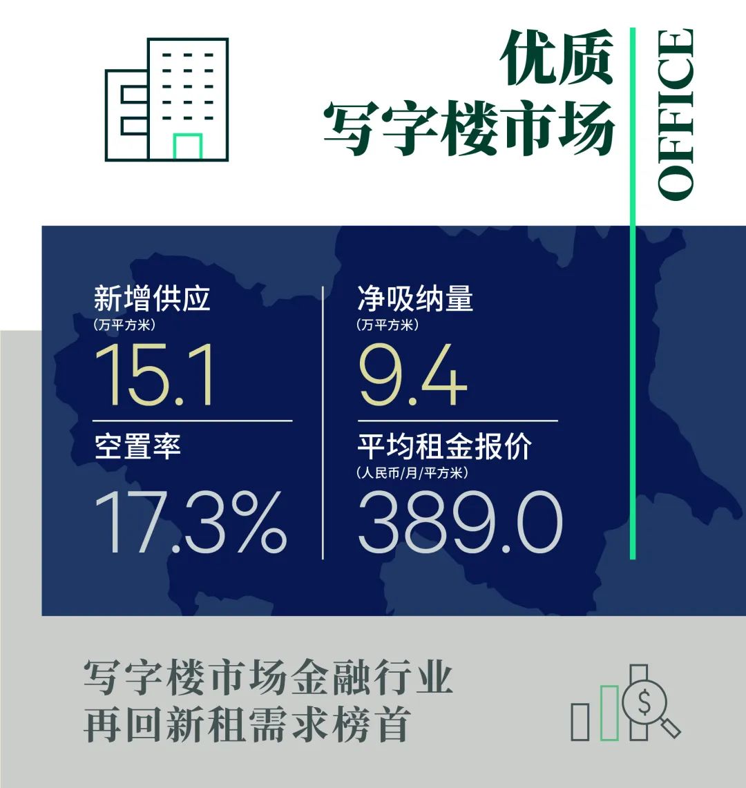 全市租金报价每月每平方米389元,剔除新项目影响环比持平。从成交看,CBD和丽泽需求持续放量下,业主议价能力小幅回升;金融街、东二环、燕莎等空置率抬升的子市场则面临一定的下行压力。