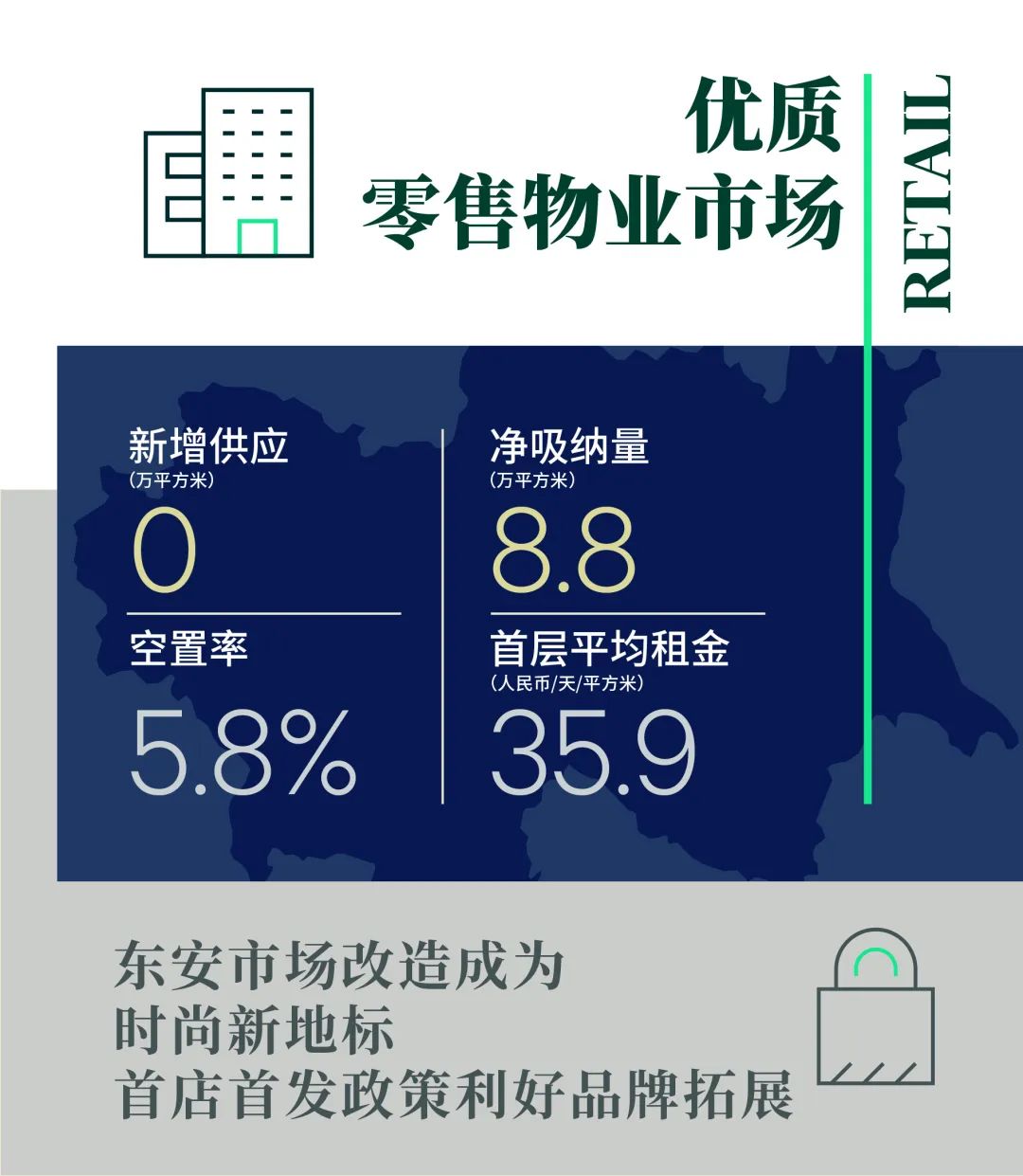 核心商圈运营成熟的项目租金稳健,业主通过引进更优质零售品牌实现业态和品牌结构升级,租金小幅上调,推动全市购物中心首层平均租金同样本比环比上升0.4%至每天每平方米35.9元。由于零售业态扩张需求仍显偏弱,购物中心业主品牌甄选和租金策略均保持谨慎,整体尤其是非核心市场租金水平仍未恢复到疫情以前水平。