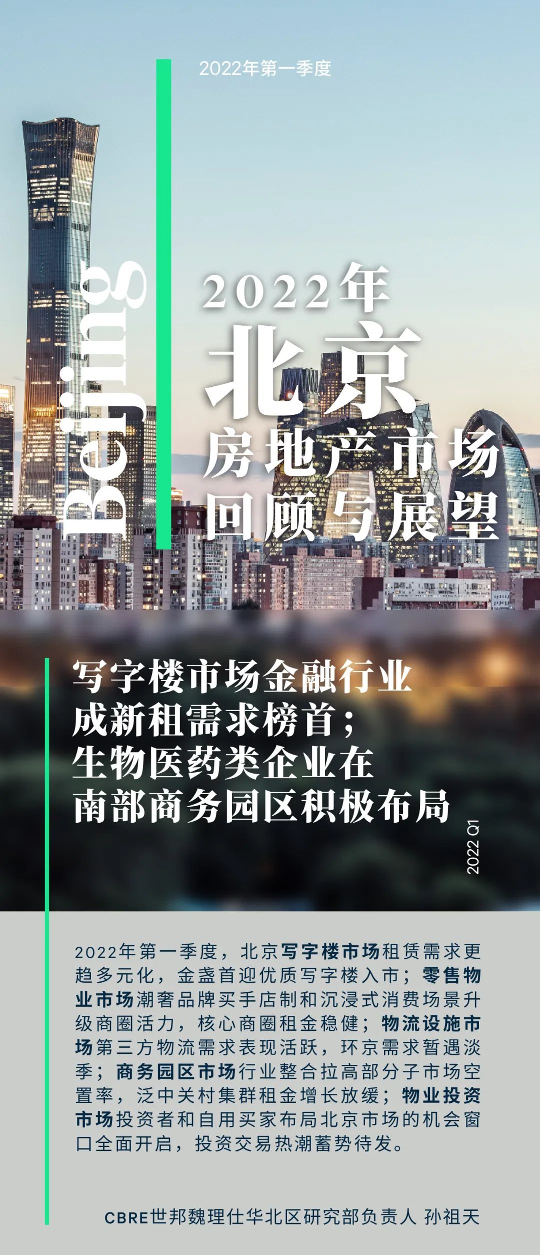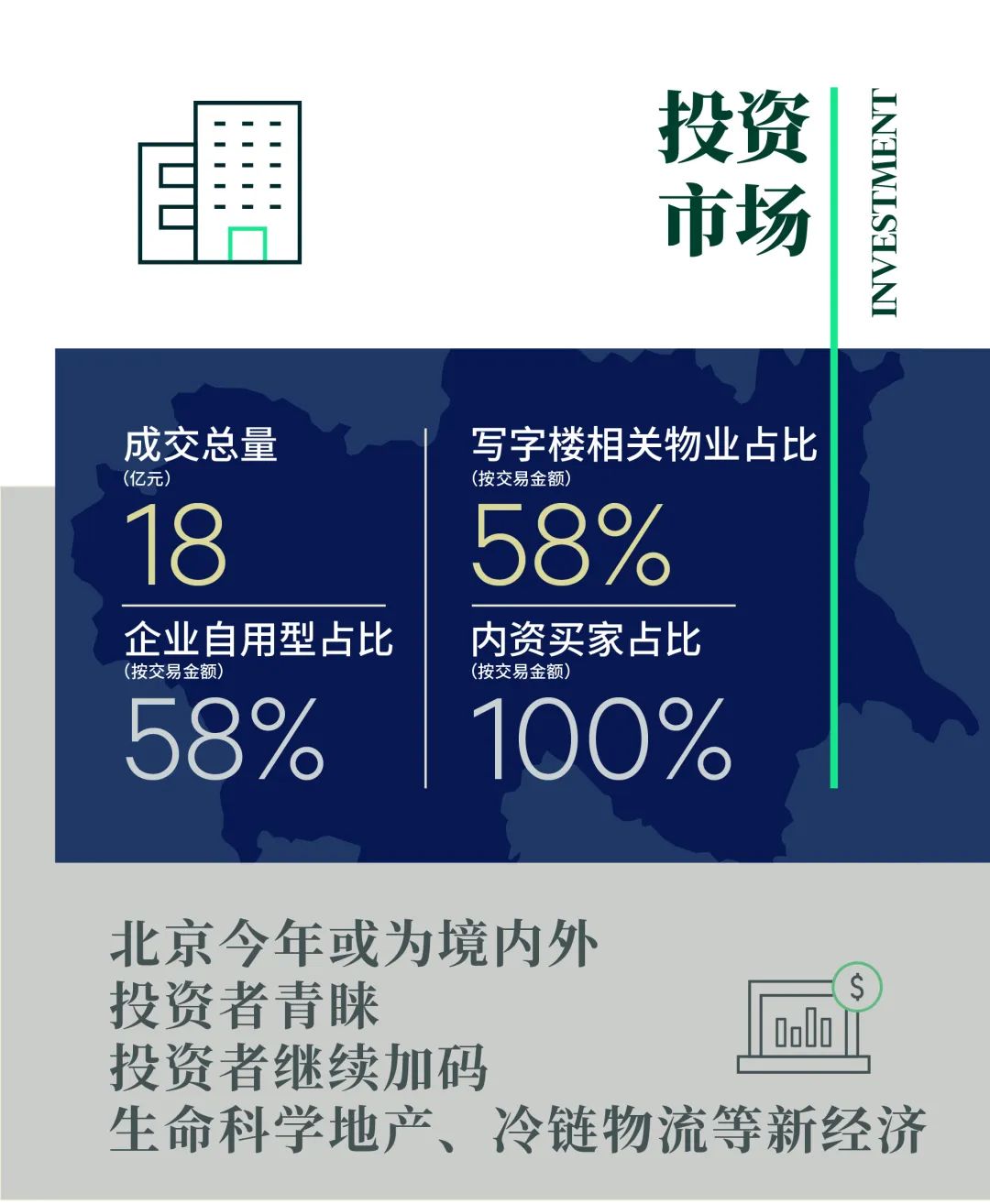 开发商更积极地将优质资产,尤其是位于新兴区域的新开发物业,投放到销售市场,且交易条件更灵活,价格更有竞争力。多种物业类型选择度增加,投资者和自用买家布局北京市场的机会窗口全面开启,使得北京成为境内外投资者今年最热衷的目的地之一。CBRE年初发布的《2022年中国投资者意向调查》显示,北京的投资意向在中国区受访者的反馈中位居第二,同时也位列亚太区跨境投资目标城市的第五位。投资者的策略选择也更为灵活开放,核心(增益)型、增值型和机会型策略均有大量适配的优质资产,投资者对新兴区域也更为了解和接受。受REITs市场良好表现的推动,投资者继续加码生命科学地产、冷链物流等新经济、新基建类资产,也在长租公寓领域积极寻求突破。而另一方面,买家对卖家提供的价格折扣仍有进一步要求,双方价格预期差异是交易达成的最大障碍。