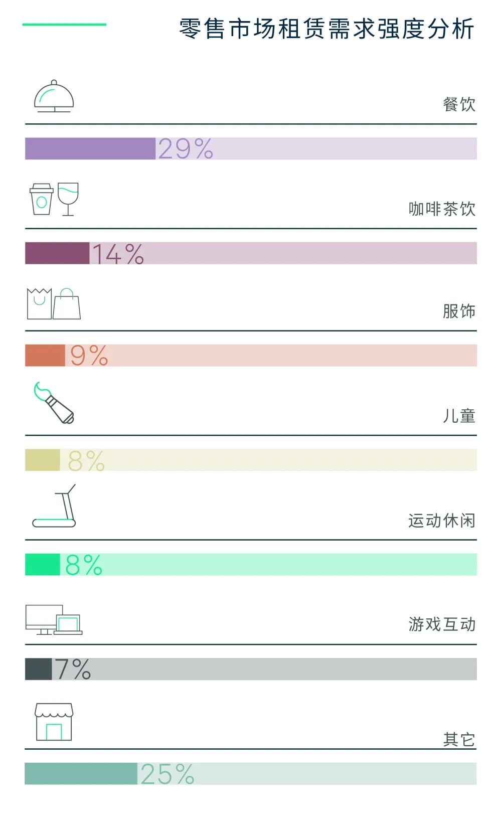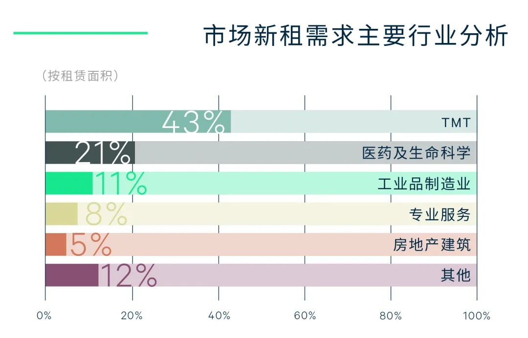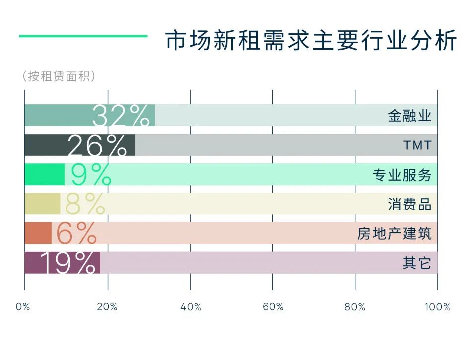 金融重回新租需求行业榜首(占比32%),其中证券、基金以及金融科技扩租需求强劲。TMT的新租需求则集中在软件开发、互联网+消费服务及人工智能等领域。随着租户对共享办公的使用和业主接受度的提升,第三方办公继续增设新点,新租占比超过专业服务业位列第三。此外,消费品制造和医药及生命科学需求稳步增长。中等面积的新租需求渐成主流,季内1,000-5,000平方米的新租交易面积占比达51%,较去年全年的42%有明显提升。