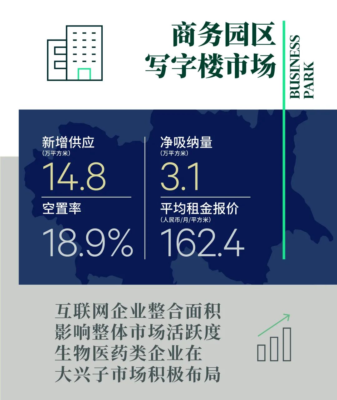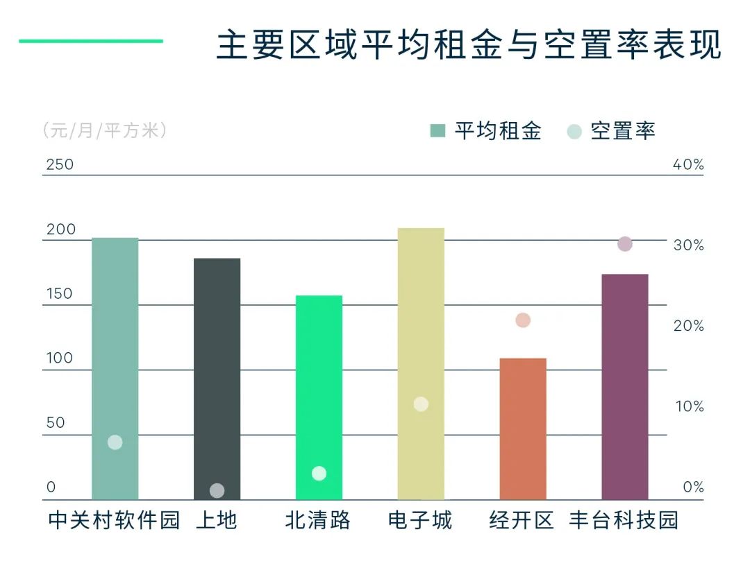 全市商务园区平均租金报价同样本比环比下降0.1%至每月每平方米162.4元。泛中关村集群整体租金同样本比环比微涨0.1%,仅有北清路子市场小幅上涨,而上地、中关村软件园和东升结束去年租金高速增长,环比持平。而经开区、丰台科技园子市场依旧面临空置压力,环比小幅下调租金。