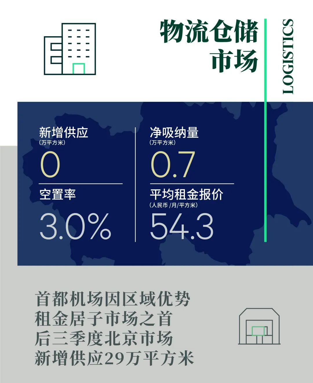 平均租金同样本比环比增长0.9%至每月每平方米54.3元。经开区和马驹桥因离市中心最近而成为城市配送需求首选,租金增长最快。而首都机场区域则凭借其对航空运输和医药配送类租户的吸引力,租金稳步上涨并仍居各子市场之首。