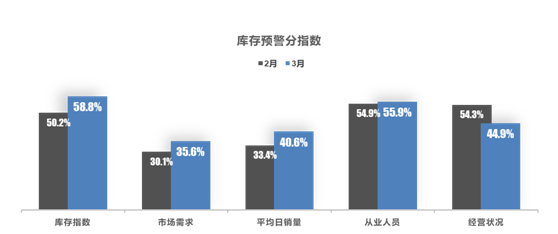 从分指数情况看:3 月库存、市场需求、平均日销量、从业人员指数环比上升,经营状况指数环比下降。1-2 月份终端销量未达预期,加上季末补库,致使库存持续增加;疫情影响下经销商盈利空间受限。