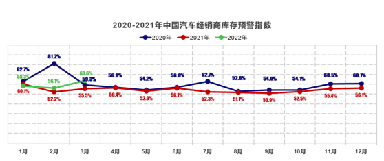 中国汽车流通协会发布的最新一期 “中国汽车经销商库存预警指数调查”VIA(Vehicle Inventory Alert Index)显示,2022 年 3 月中国汽车经销商库存预警指数为 63.6%,同比上升 8.1 个百分点,环比上升 7.5 个百分点,库存预警指数位于荣枯线之上。3 月疫情在多地反扑,汽车生产、销售、消费及出行均受到较大影响,整体市场处于不景气区间。