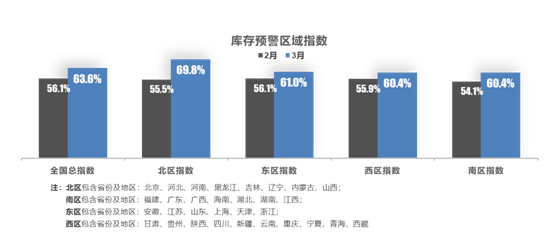 从区域指数情况看:3 月全国总指数为 63.6%,北区是本次疫情的 “重灾区”,北区指数为 69.8%,东区指数为 61.0%,西区指数为 60.4%,南区指数为 60.4%。疫情在多地扩散,超过 20 个地级市重点防疫,销量下滑导致库存增加。