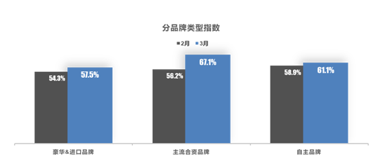 从分品牌类型指数看:3 月进口 & 豪华品牌、主流合资品牌、自主品牌指数环比上涨。