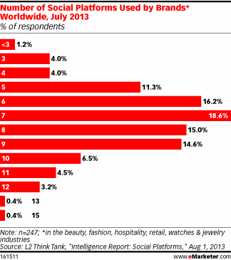 L2 Think Tank 2013年7月对大约250个品牌做了调查,发现很大一部分跨国品牌都在使用各种各样的平台与他们的客户交流。多于1/3的人表示,他们使用的平台数介于5至9个之间。
