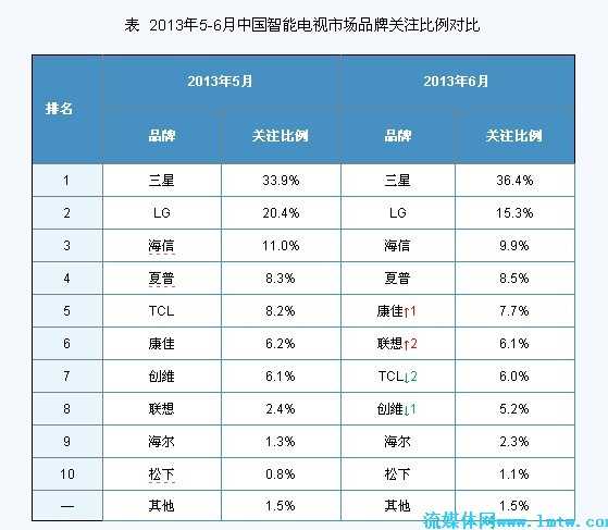 2013年6月,中国智能电视市场上,韩系品牌三星和LG依旧占据了市场超过五成的关注度,其中,本月三星蝉联品牌关注榜冠军,关注比例达36.4%,较5月上涨了2.5%。LG则保持亚军位置不变,本月关注比例为15.3%,较上月有一定下滑。