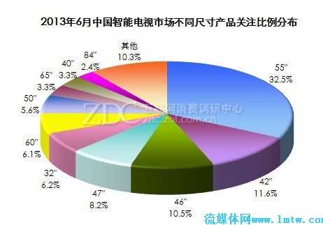 2013年6月,中国智能电视市场上,消费者的关注重心依旧集中在40英寸以上,可以发现,关注比例靠前的十种屏幕尺寸中有九种尺寸在40英寸以上,其中,55英寸以32.5%的关注比例继续成为本月最受消费者关注的电视屏幕尺寸,42英寸与46英寸的关注比例也都在10.0%以上,分别为11.6%和10.5%。