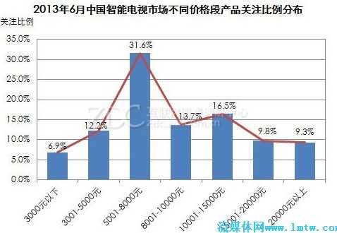 2013年6月,中国智能电视市场上,5001-8000元以31.6%的关注比例继续成为本月最受消费者关注的价格段,基本与上月持平。与5月不同的是,本月8001-10000元与10001-15000元价格段的关注比例均有出现一定下滑,而3001-5000元的关注占比有所上涨,达到12.2%,较5月上升了2.3%。