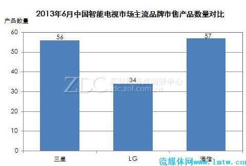 据ZDC统计数据显示,2013年6月,中国智能电视市场上,海信本月新增八款智能电视,成为主流品牌中拥有智能电视数量最多的品牌;三星保持56款智能电视数量不变;LG的产品数量相对较少,为34款,与上月持平。