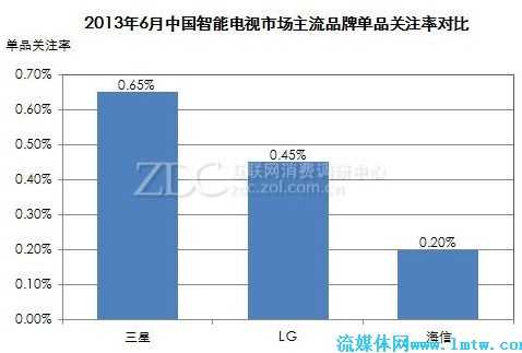 2013年6月,中国智能电视市场上,在单品关注率方面,三星再次与LG拉开差距,本月达到0.65%,而LG下滑至0.45%,此外,作为前三强品牌中唯一的本土品牌,海信的单品关注率相对较低,仅为0.20%,亟需提高。