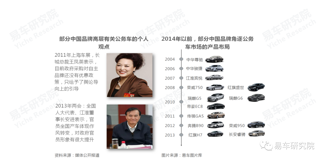 21 世纪前十多年,由于私家车消费快速崛起,导致了公务车市场份额的快速萎缩,但仍维持着较高的年销量与保有量占比,且单车利润高,是不折不扣的 “优质细分车市”。2014 年之前,角逐公务车市场是中国品牌高端化的核心突破口,围绕公务车市场,推出了尊驰、宾悦、荣威 750、荣威 950、盛世、传祺 GA5、奔腾 B90 等一大堆高级别轿车。在两会等关键场合,广大车企代表积极游说各级政府部门的公务车要采购中国品牌;