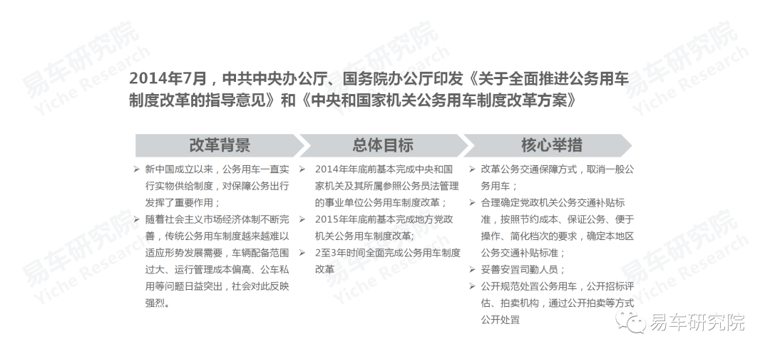 2014 年公车改革的核心背景是,随着社会主义市场经济体制不断完善,实物供给主导的传统公务用车制度,越来越难以适应形势发展需要,车辆配备范围过大、运行管理成本偏高、公车私用等问题日益突出,社会对此反映强烈。2015-2017 年,随着取消一般公务车、发放交通补贴等具体政策的全面落地,不仅在防止腐败、缓解财政压力等诸多方面,取得了非常直接的社会价值,也衍生出不少潜在价值,诸如鼓励公务员买车,扩大车市消费,促进内需等;
