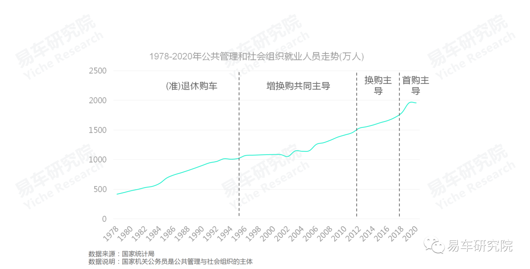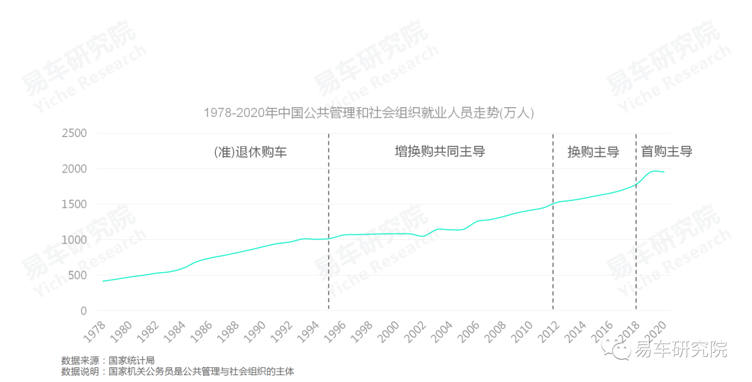 改革开放之后的近 40 多年 (1978-2020 年),中国以公务员为主的公共管理与社会组织人员数量不断增加, 1982 年突破 500 万人,1993 年突破 1000 万人,2012 年突破 1500 万人,2019-2020 年接近 2000 万人,为公务员车市的持续繁荣,提供了基本保障;