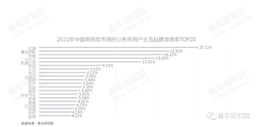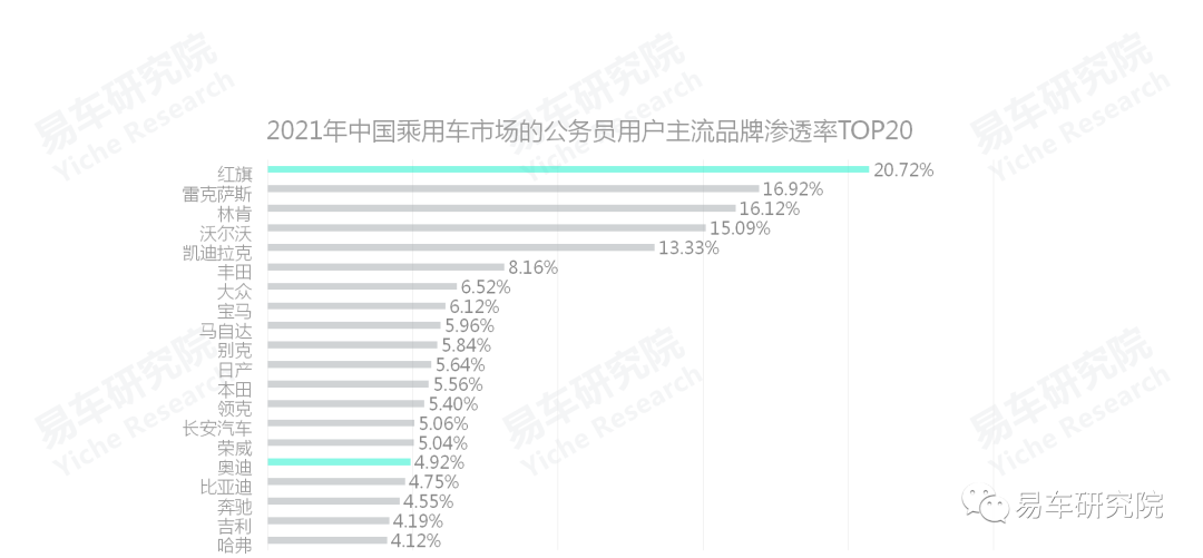 公务员车市低调但不低价,高端品牌第二阵营的渗透率力压奥迪、奔驰、宝马,红旗领衔 2021 年公务员车市品牌渗透率排行