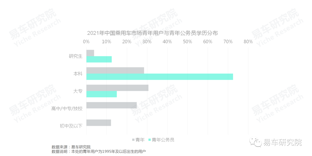 由于公务员团队的招聘门槛更高,使得公务员车市以本科及以上的高学历用户为主,占比高达 72.86%,大幅高于大盘的 31.17%;