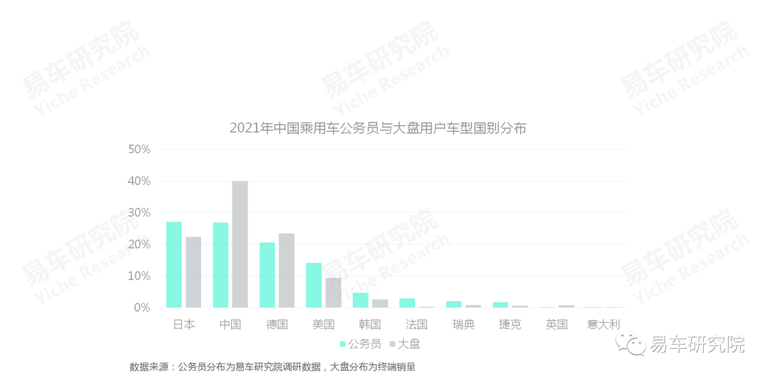 从中国乘用车的国别看,用户买的最多的当然是中国品牌,爱国消费溢于言表,终端销量占比近四成,但易车研究院调研发现,2021 年公务员首选日系,占比 27.04%,高于中国品牌的 26.87%,与大盘分布反差鲜明;