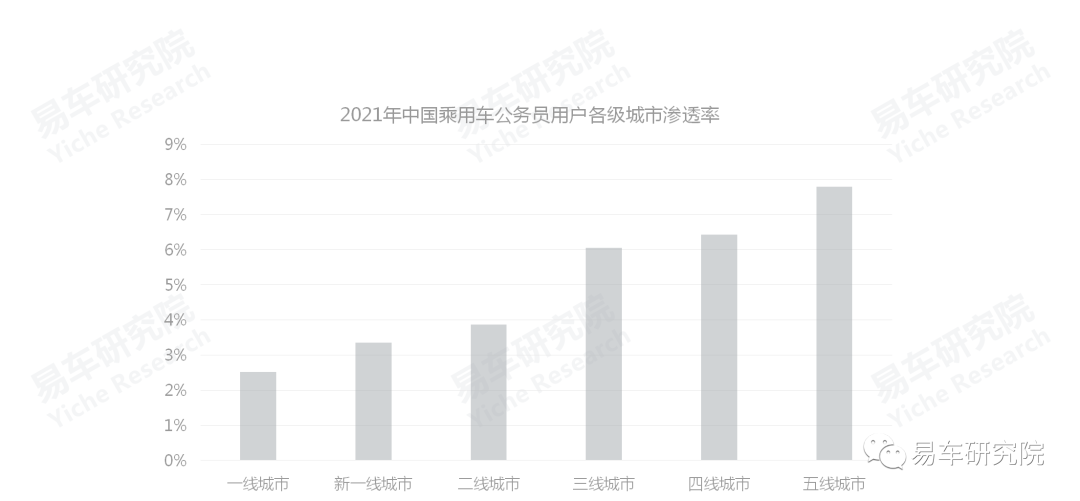 由于公务员团队的用车场景更集中上下班,甚至涵盖少部分公务用车场景,使得公务员用户在中高级别车型的渗透率更显著;