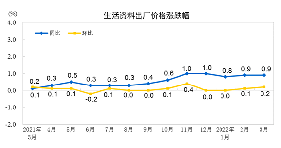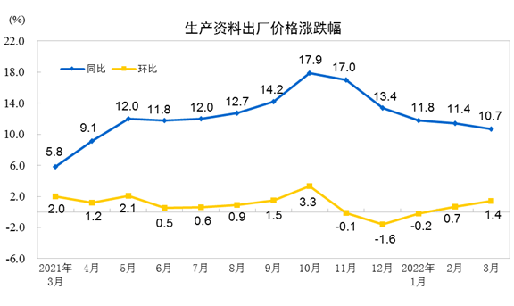 2022 年 3 月份,全国工业生产者出厂价格同比上涨 8.3%,环比上涨 1.1%;工业生产者购进价格同比上涨 10.7%,环比上涨 1.3%。一季度,工业生产者出厂价格比去年同期上涨 8.7%,工业生产者购进价格上涨 11.3%。