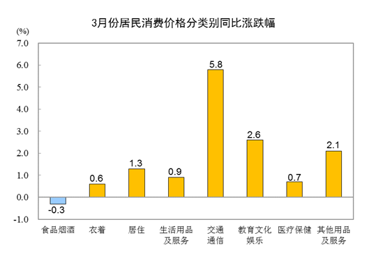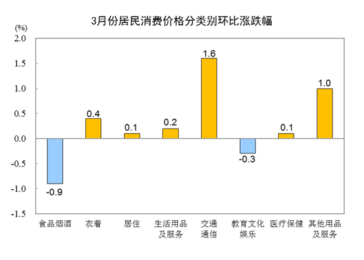 3 月份,食品烟酒类价格环比下降 0.9%,影响 CPI 下降约 0.26 个百分点。食品中,畜肉类价格下降 4.9%,影响 CPI 下降约 0.15 个百分点,其中猪肉价格下降 9.3%,影响 CPI 下降约 0.12 个百分点;鲜果价格下降 2.3%,影响 CPI 下降约 0.05 个百分点;水产品价格下降 2.1%,影响 CPI 下降约 0.04 个百分点;粮食价格上涨 0.5%,影响 CPI 上涨约 0.01 个百分点;鲜菜价格上涨 0.4%,影响 CPI 上涨约 0.01 个百分点。
